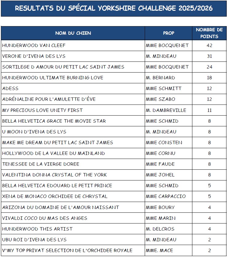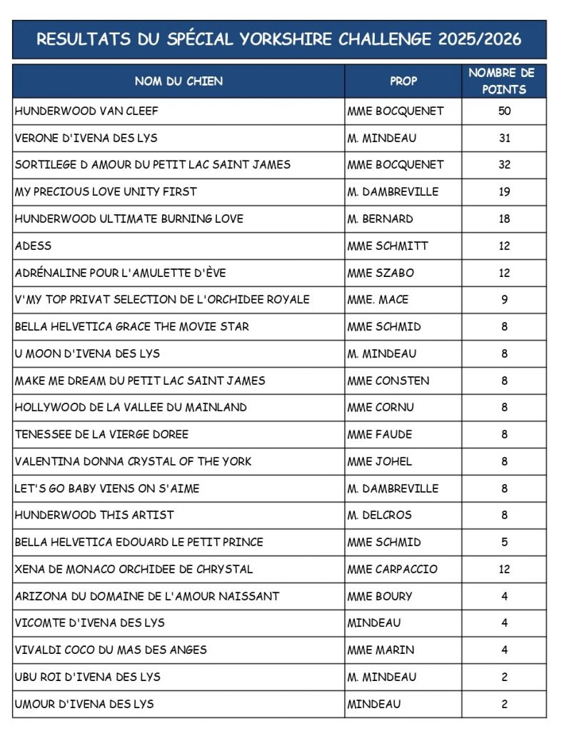 Classement du “Spécial Yorkshire Challenge” et “Spécial Biewer Challenge”
